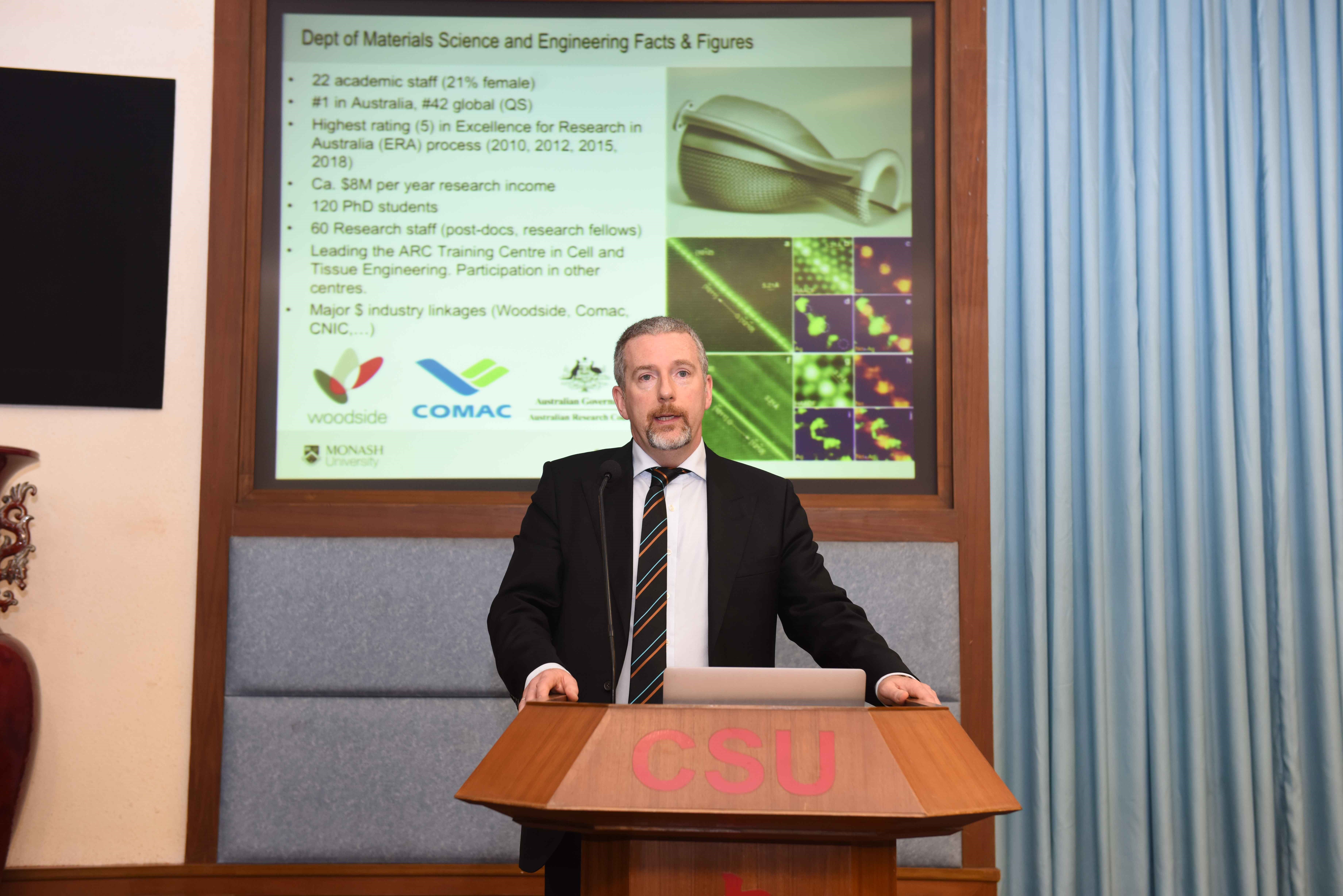 蒙纳士大学材料系主任Neil Cameron、土木系教学主任Colin Caprani分别谈到选择蒙纳士大学的优势、蒙纳士大学毕业生的去向问题。Caprani教授介绍了公司的运作方式、课程安排及员工的学习任务,让新生们对两年后的老员工活有了更深入的了解。Neil Cameron教授表示蒙纳士大学与很多企业都有合作关系,能提供给同学丰富的实习机会。在蒙纳士大学就读的中国员工有50%都会留在本校继续学习,或者考入其它名牌大学,例如剑桥大学、牛津大学。他还和在场的同学们分享了蒙纳士大学一篇发表于《Nature》,两篇发表于《Science》的论文。