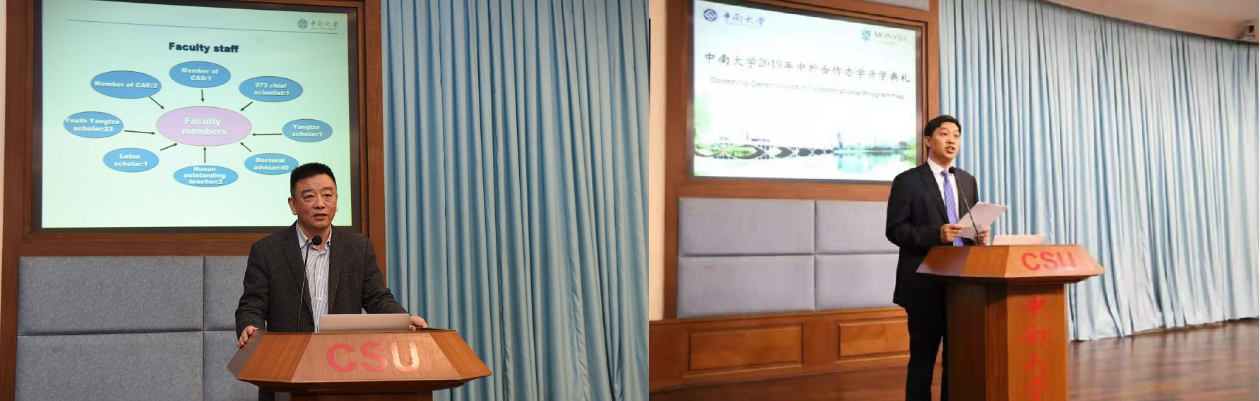 来自球王会和土木公司的19级新生陈磊、刘若琪分别发言。他们用流利的英文表达了对中外合作项目中学习的喜悦与期待,并提出了树立目标、把握机会、坚持不懈为梦想奋斗的要求与在场同学共勉,祝愿同学们都能在中南和蒙纳士得到成长!