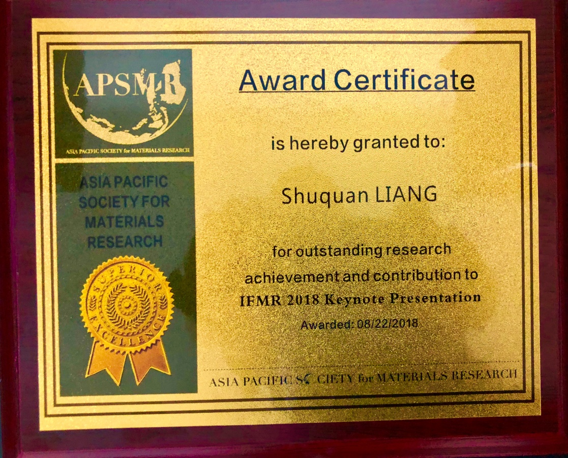 为表彰梁叔全教授带领团队在上述领域做出的突出成绩。APSMR(Asia Pacific Society for Materials Research,亚太材料研究学会在主旨报告结束后,为梁叔全教授颁发杰出研究成就奖状。