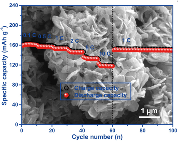 该研究报道了一种熔融烃辅助固相烧结法制备具有均匀纳米片结构的嵌布式复相磷酸盐正极材料8LiFePO4·Li3V2(PO4)3/C。制备的纳米片厚度在20-50纳米之间,且相互交接形成高度开放的多孔结构,其比表面积高达30.21 m2 g-1,LiFePO4和Li3V2(PO4)3均匀地分布在纳米片中,纳米晶周围均匀的包覆着油酸原位碳化而成的导电碳层。所制备的纳米片复合材料作为锂离子电池的正极材料,实现了高比容量、高循环稳定性和倍率性能。在10C的大电流密度循环下,仍可得到118.6mAh/g的可逆容量;在2C和5C的电流密度充放电条件下,循环1000圈,容量保持率分别为93.21% 和88.7%。研究成果的优势在于:(1)该方法结合固相反应和自组装的优势,简便易行,采用的油酸和石蜡价格便宜,安全性能好;(2)二维纳米片结构缩短了锂离子的扩散路径,多孔结构增加了电极材料与电解液的接触面积;(3)纳米片之间充足的空间易于电解液的渗透且可调控因充放电而造成的体积应变;(4)具有电化学活性的元素(Fe2+/V3+)在主相LiFePO4和Li3V2(PO4)3中交互掺杂,有效提升了电极材料的导电性和离子扩散速率;(5)纳米晶周围均匀的碳包覆层有效提升了电子导电性且助于保持结构的稳定性。这种材料设计思路及方法对高温条件下的纳米组装可控制备具有重要意义。