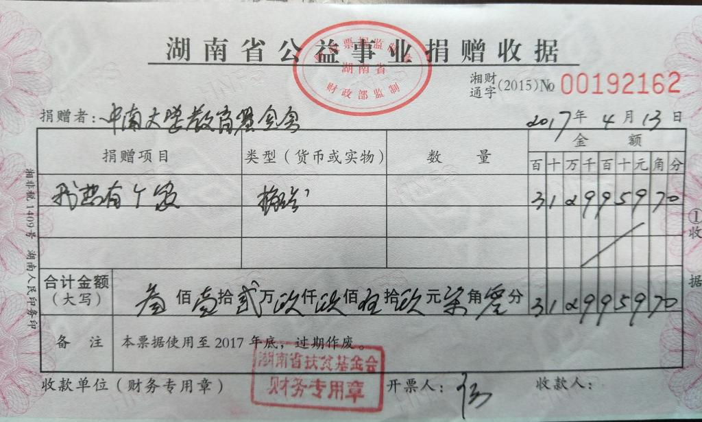 3、湖南省扶贫基金会开具的《公益事业捐款收据》
