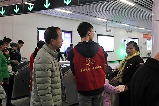 14:00,志愿者到达橘子洲地铁站。换上印有“长沙青年志愿者”字样和志愿者标志的红马甲,他们便积极投入到工作中。志愿者们主要有两个工作,一是在自助售票机旁帮助不懂购票流程的乘客顺利购票;二是在闸机旁帮助遇到问题的乘客正常通过闸机。橘子洲景区没有公交车站,造成地铁站人流量大,因此志愿者的工作就显得十分有必要。