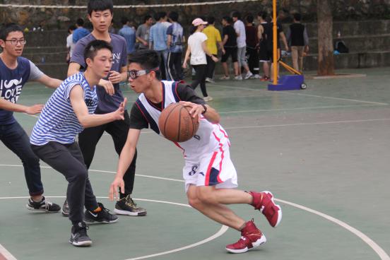 尽管这些比赛十分消耗体力,同学们仍意犹未尽地进行“链接加速”的游戏。三或四人为一个小组,每个同学用左手抬起前面一个同学的左脚,右手则搭在前面同学的肩上,一起用右腿跳跃前进。时光飞逝,眼看上午时间就要过去。三个班的男生进行了一场篮球友谊赛。没有人关注这场比赛的输赢,大家都很尽兴。