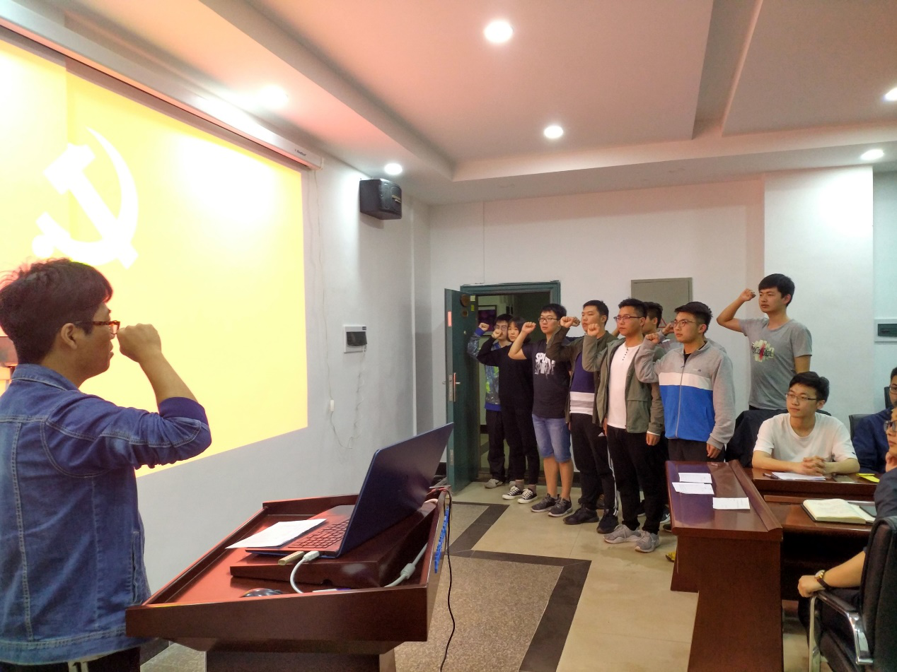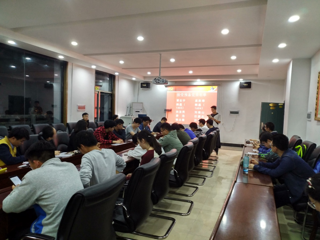 大会第一项议程是讨论10名预备党员转正以及10名新发展党员事宜。首先是申请转正的预备党员本人及其培养人发言,每一位转正党员都简要地汇报了他们在培养期内的表现,主要展示自己的缺点与不足,普遍表示在入党后会更加严格要求自己,然后其相应的培养人从实际出发,根据对预备党员的考察情况给出了中肯的评价并表决是否推荐其入党;接着由10名新发展党员发言,汇报其成为入党积极分子后的基本情况,他们不仅介绍了自己对党的认识,还指出了自己的缺点,以及在未来会克服困难、改正缺点的决心,接着再由相应的入党介绍人介绍其在培养考察期的表现情况,并表决是否推荐其成为预备党员。所有预备党员及新发展党员同志发言后,大会进行无记名投票表决,最终,全票通过10名预备党员转正以及接收10名预备党员的决定。然后,10名预备党员在组织委员张昭的带领下,大声宣读入党誓词。