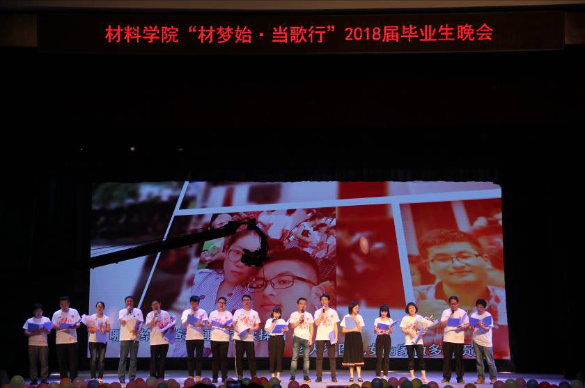 6月2日晚7点,以“材梦始,当歌行”为主题的球王会2018届毕业生晚会在南校礼堂隆重举行。球王会体育官网学工部副部长张江华、球王会体育官网团委副书记邓磊、球王会经理梁叔全、党委书记王德志、党委副书记胡小清、副经理冯艳、航空航天公司党委副书记邓栗、粉末冶金研究公司党委副书记何桂强、冶金与环境公司党委副书记张凯,球王会各系所主任、院工会委员及教师代表、全体学工办老师、毕业班班导师莅临晚会现场,与全体2018届毕业生和家长们齐聚一堂,欢庆毕业!友好单位长沙新东方培训公司天马校区董事长钟铁生一行也来到晚会现场共襄盛会,晚会由长沙升华微电子有限公司倾情赞助。