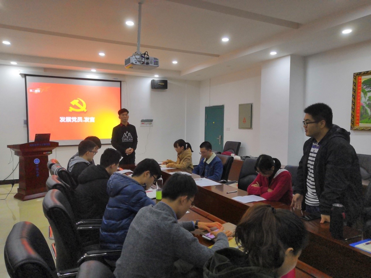发展对象魏树兵、武忠玮、黄运通、赵耀、刘诗怡、黄伊宁等六人分别向大家陈述了自己的入党动机和未来计划。“大学霸”武忠玮分享自己是如何让快乐与学习完美结合在一起的,成功做到边学边玩。