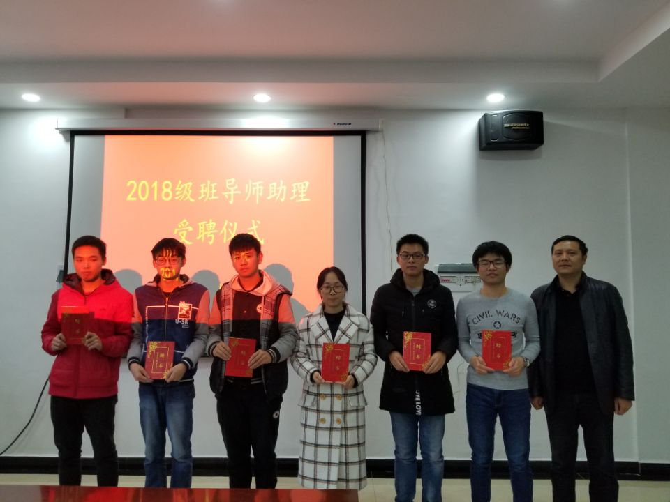 伴随着激昂的音乐,王德志书记为2018级各班班导师助理颁发聘书。班导师助理代表郝斌、许文杰及覃佐宇三位同学依次上台发言,简述了工作情况并分享了身为班导师助理的感受。同时,他们也就在班级中出现的问题进行了分析,并提出自己的一些建议和与之相对的解决方法。