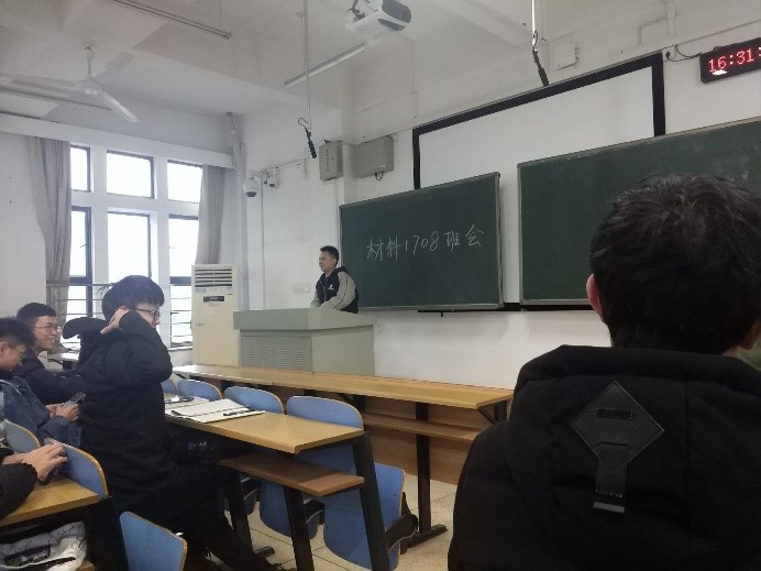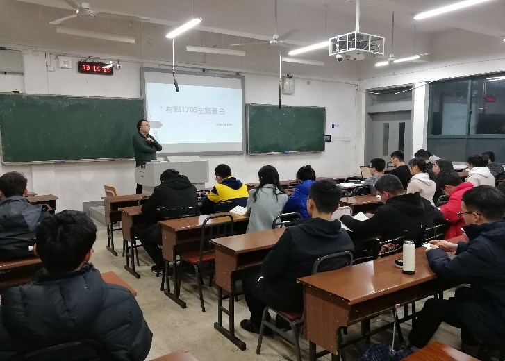 在材料1705班的班会中,班长就上学期的班级活动和学习情况进行了总结,并在此基础上提出了新学期的学习任务与目标。此外,还根据班级自身的情况,组织了本学期的周末锻炼和集体自习活动。之后,班导师以PPT的形式向同学们介绍了材料学领域的研究进展与未来的发展方向,使得同学们对材料学有了更深一层的认识与理解。根据新学期的教学指导,班导师还向同学们介绍了一些学习的方法,并划出了学习的重点之处,为同学们指点了迷津。