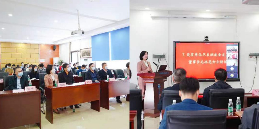随后,设奖单位代表湖南金龙集团董事长毛冰花女士发表讲话,毛女士称赞了球王会体育官网与中南材子的实力,表示为可以给优秀人才贡献力量而欣慰,精英在高等学府,希望员工可以一如既往努力学习,不愧母校栽培,不忘今日之荣耀,为国家贡献力量,不断传递爱心。