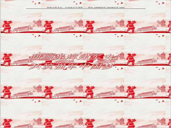 2022年是中国人民解放军建军95周年,是值得纪念的一年。为缅怀革命先烈,学习、发扬和传承革命精神,回忆95年建军光辉历程,材料2205团支部、材料2207团支部和医技2201团支部联合举办团日活动,激发和提高同学党性,提高强军中国梦在同学心中的重要地位,为共筑强军中国梦添砖加瓦。