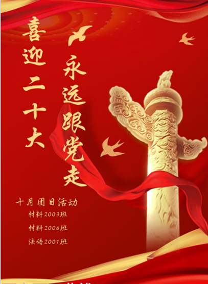 金秋十月,丹桂飘香。在2022年10月16日,中国共产党第二十次全国代表大会将在北京召开。为进一步加强对团员和青年员工爱党爱国爱社会主义教育,引导广大团员青年以积极向上的精神面貌迎接党的二十大的召开,球王会本科生2006团支部,2003团支部及法语2001团支部展开联,在2022年10月10日-2022年10月23日内开展多种活动。